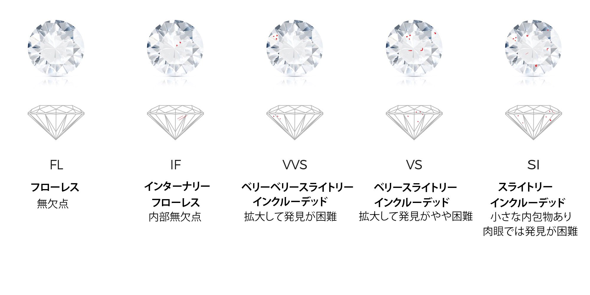 高品質でありながら、VVSクラリティと比較し価格を抑えられるグレード。熟練の鑑定士であれば10倍の拡大鏡で内包物や疵を確認出来るが、肉眼では見ることが出来ない。VVSとの識別も、肉眼では不可能。