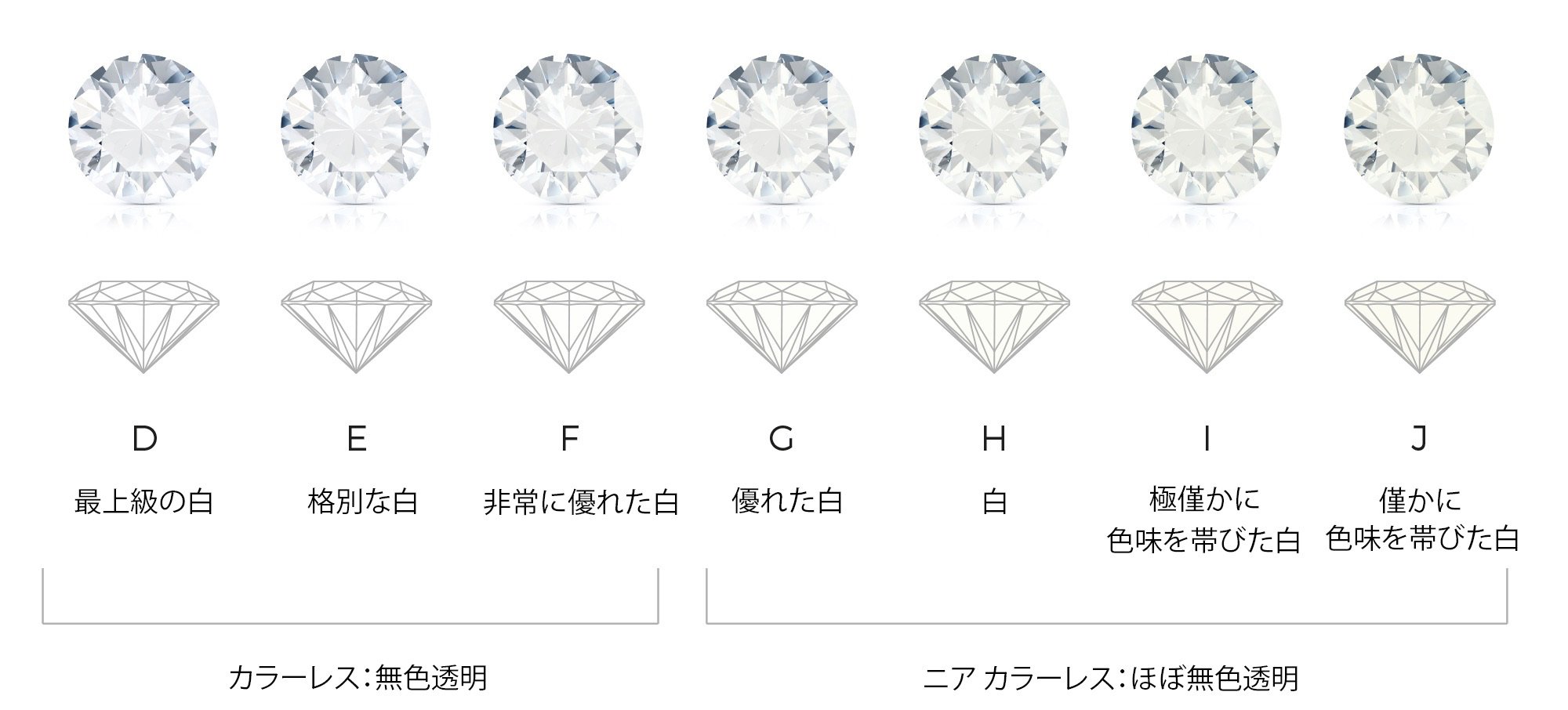 ほぼ無色透明で、上位のダイヤモンドに比べてかなり価格を抑えられるグレード。僅かな色味はあるが、婚約指輪としても十分に使用できる白さ。