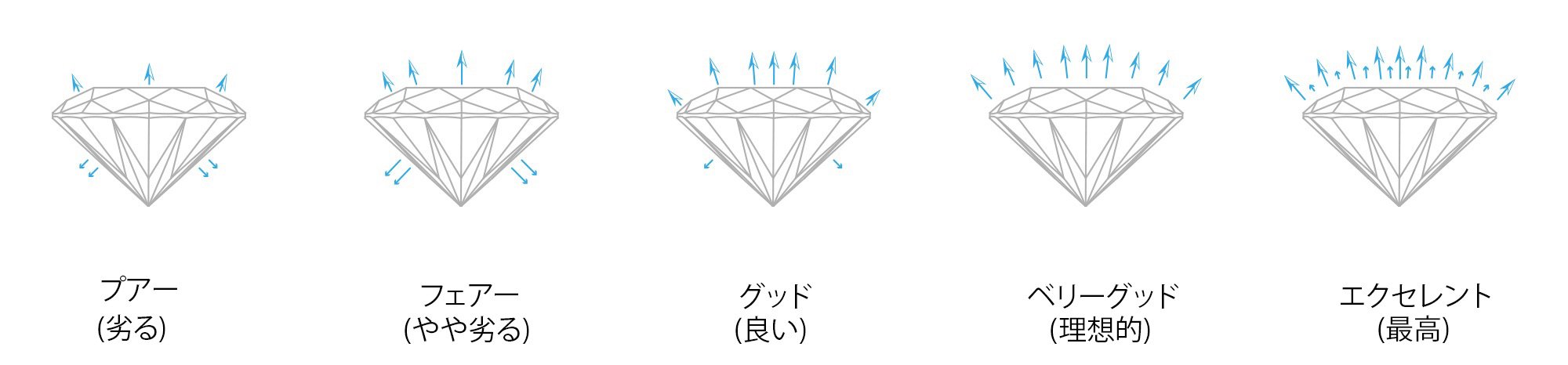ファンシーカットあるいはファンシーシェイプと呼ばれる、ラウンド以外の形のダイヤモンドにはGIAのカットグレードは付与されません。ラウンドのように決められた比率がなく、それぞれがユニークな形をしているため、一つの同じ基準で評価することが出来ないからです。 Kensington Diamondsではペア、オーバル、クッション、エメラルド、プリンセス、ラディアント、アッシャー、マーキースのダイヤモンドはポリッシュ(研磨状態)とシンメトリー(対称性)がVery Good以上、なおかつ独自の基準でプロポーションや輝きが素晴らしいダイヤモンドのみを取り扱います。 プロの目線で選別し、輝きや煌めきが乏しいダイヤモンド、見た目の美しくないダイヤモンドは除外されます。